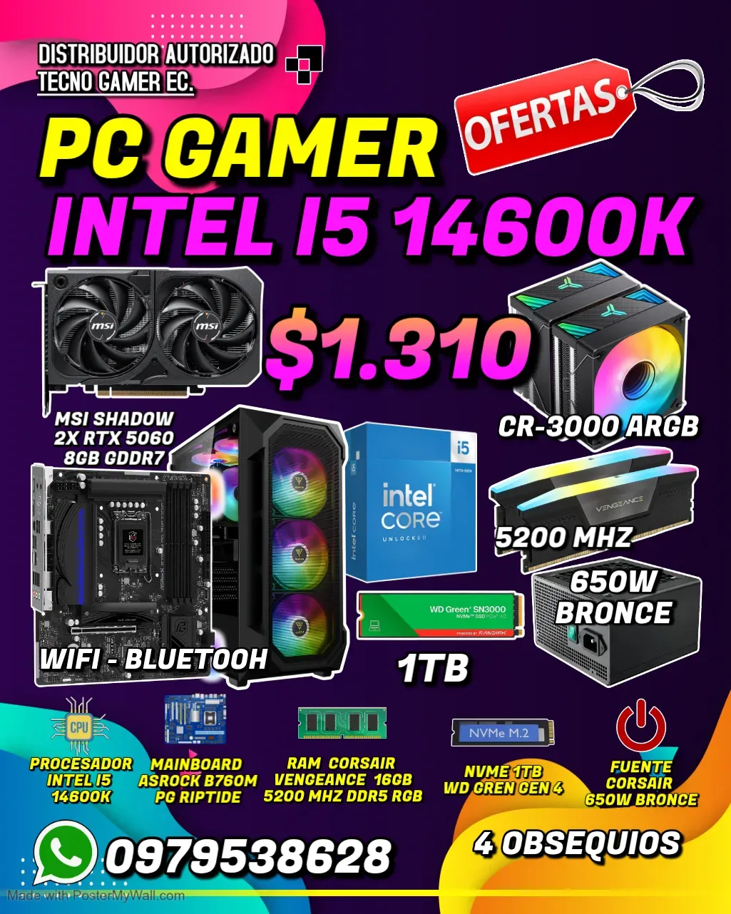 Promo Pc Gamer Intel I5 14600k, 16Gb ram Ddr5, Almacenamiento Nvme 1Tb, Video Rtx 5060 Gigabyte 8Gb Gddr7.