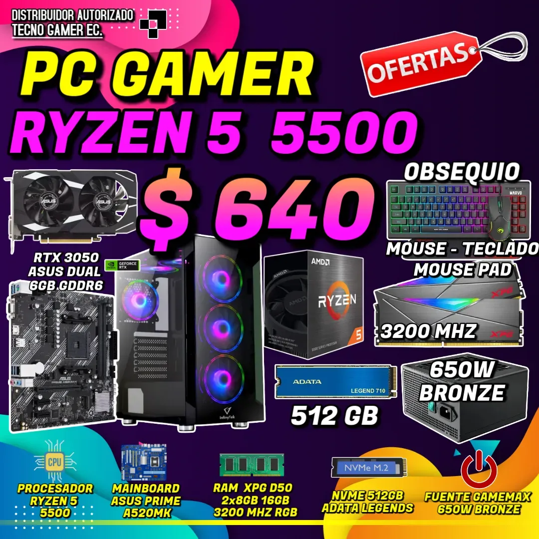 Promo Pc Gamer Ryzen 5 5500, 16Gb ram, Almacenamiento Nvme 512Gb, Tarjeta de Video Rtx 3050 Asus Dual 6Gb Gddr6