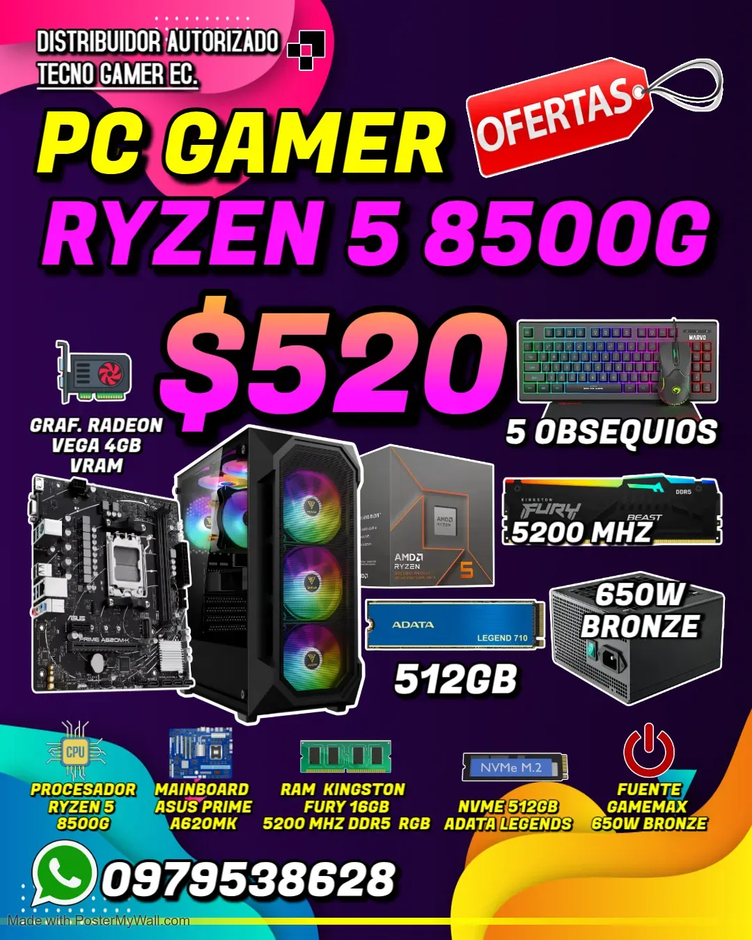 Promo Pc Gamer Ryzen 5 8500G, 16Gb ram 5200mhz rgb, almacenamiento nvme 512Gb.