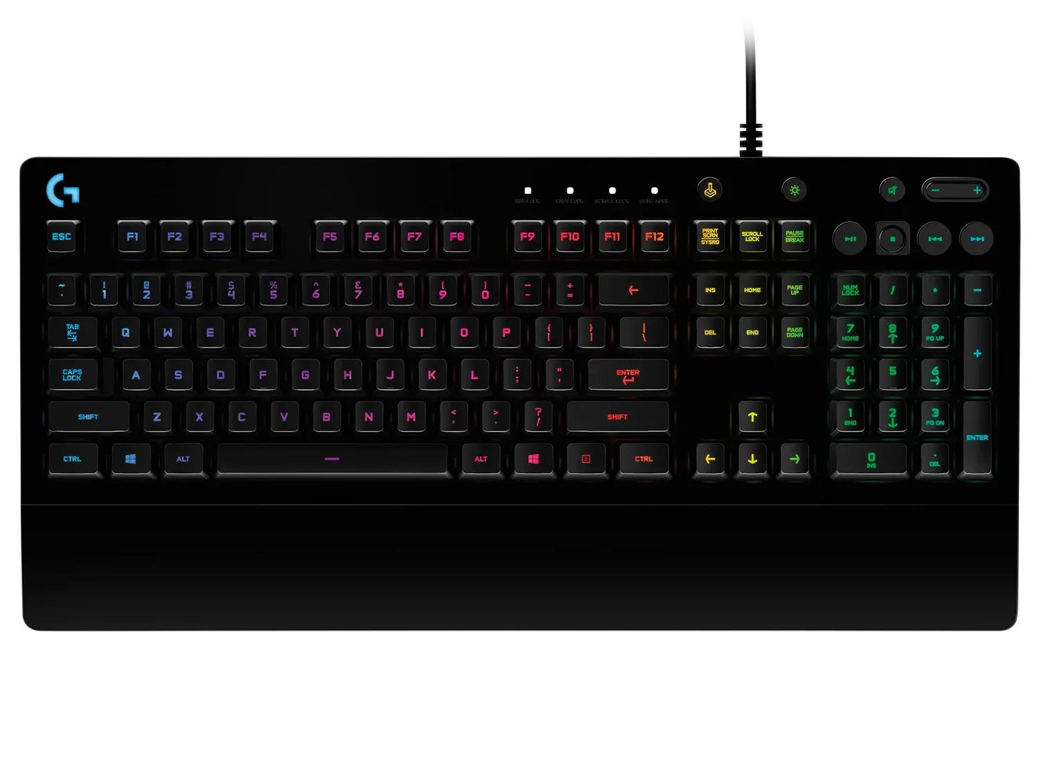 Durabilidad apta para los requisitos de los videojuegos. Los interruptores de tecla Mech-Dome táctiles son resistentes a salpicaduras. Iluminación RGB LIGHTSYNC personalizable. Reposamanos integrado y patas ajustables. Controles multimedia específicos.